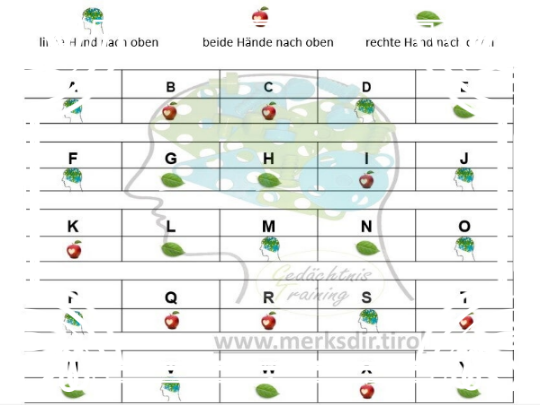 Versuchen Sie das Alphabet laut zu sprechen und zugleich die angeführte Bewegung zu machen.